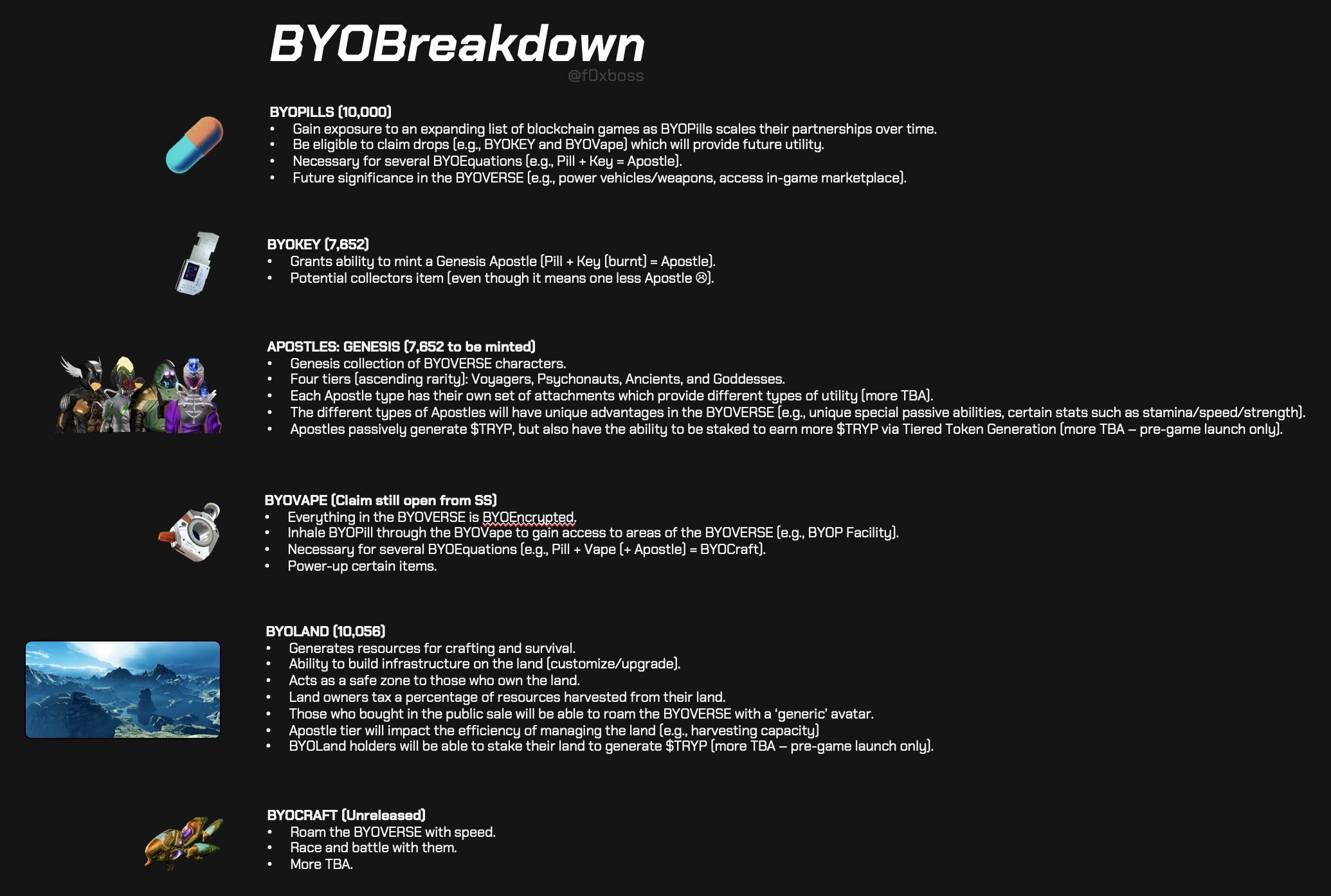 Now let’s move onto the developments of the BYOVERSE itself. Attached below is an infographic of a BYOBreakdown of all of the NFTs within the BYOEcosystem (as of now). this includes: